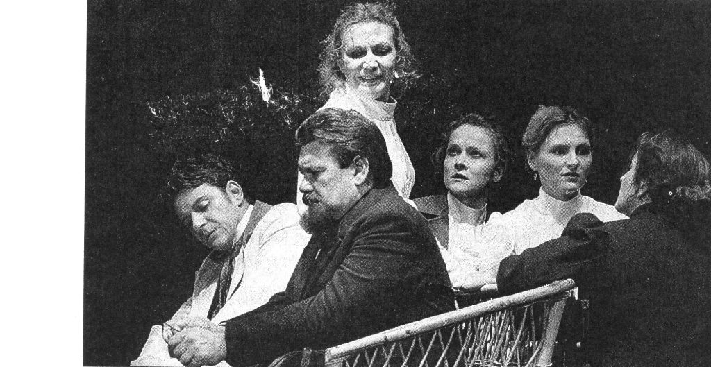 Mit einschlägiger DDR-Erfahrung kann mir der szenische Einstieg mit perfekt organisierter Jubelfeier zum zehnjährigen Bestehen des Tschechow-Protein-Kombinates, dem der Start in die Marktwirtschaft geglückt ist, ein Schmunzeln abringen. Wir erkennen uns noch. Auch die Reihe der „Geehrten“ vordem Vorhang, mit Handschlag und Blume bedacht. Das spielen Laien, die zunächst und dann wieder im Zuschauerraum verteilt sind. Besser aber noch der zur Schau gestellte Film, eine bitterböse Geschichte der Deformation. Die Delegation des Kalugaer Theaters besucht das Kombinat, verfolgt den Prozeß der Gewinnung und Herstellung des klassischen Tschechow-Proteins, das mit Produkten wie CP-Pulver, CP-Binden, CP-Spiralen oder CP-Zäpfchen rundum das Funktionieren auch von Schauspielern garantiert.Es wurden „17 612 A.P. Tschechows im Alter von 7 bis 86 Jahren verarbeitet, mit einem Gesamtgewicht von 881 Tonnen.“Alles kommentiert im noch vertrauten Verlautbarungston. Gleich vor Ort werden die Darsteller mit Tschechow-Protein-Produkten präpariert, in den Inkubator geschoben: Nach Stunden sind sie bereit. Das Spiel kann beginnen.